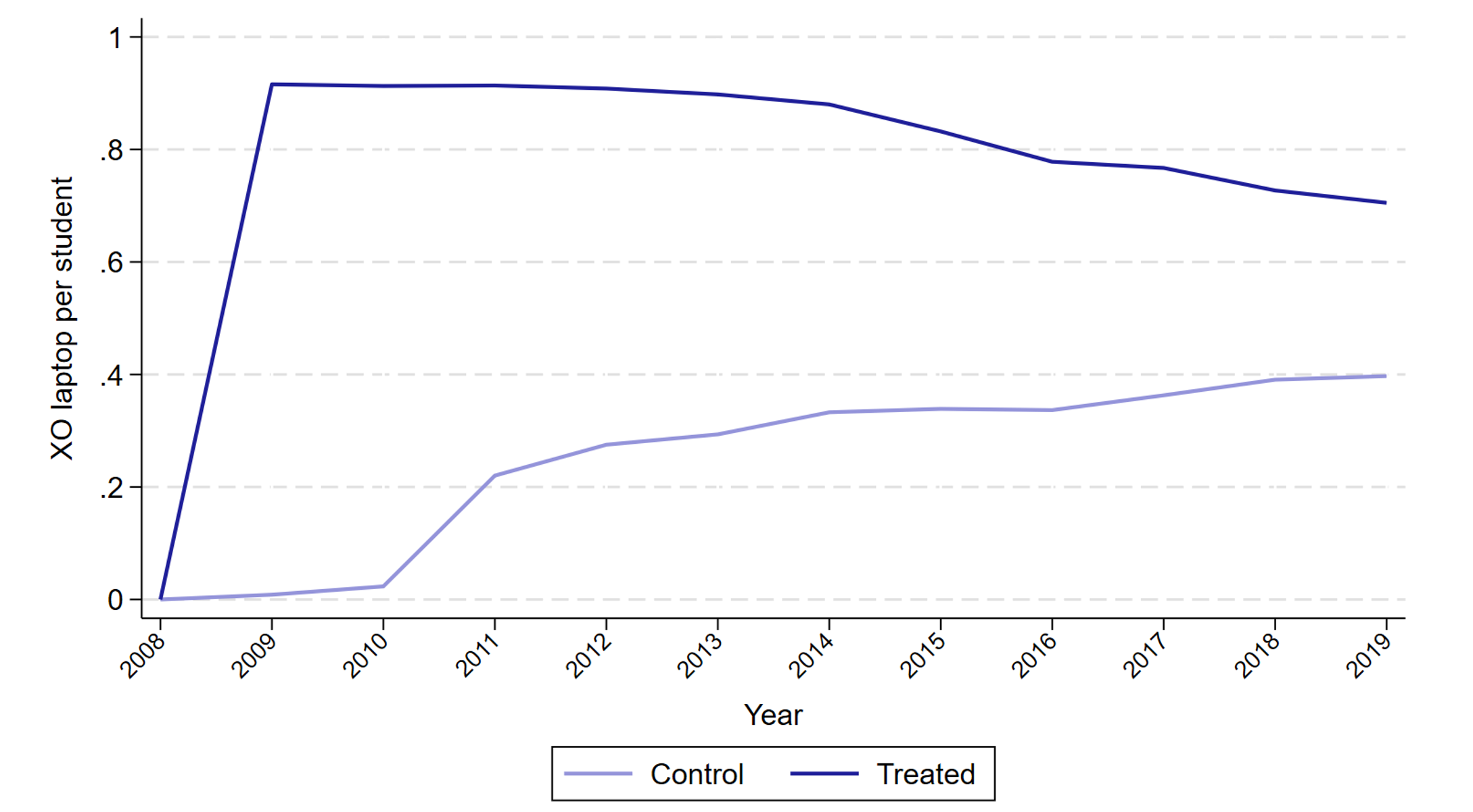 Using administrative data, Figure 1 shows that the program increased the ratio of XO laptops to students in treatment schools from 0 to almost 1 by the end of 2009. Starting in 2011, some laptops were also distributed to schools in the control group so that the average ratio of XO laptops per student in these schools eventually reached 0.4 by 2019. There was also a decline in the ratio for treatment schools over time. Still, the marked difference in access to laptops between treatment and control schools remained.