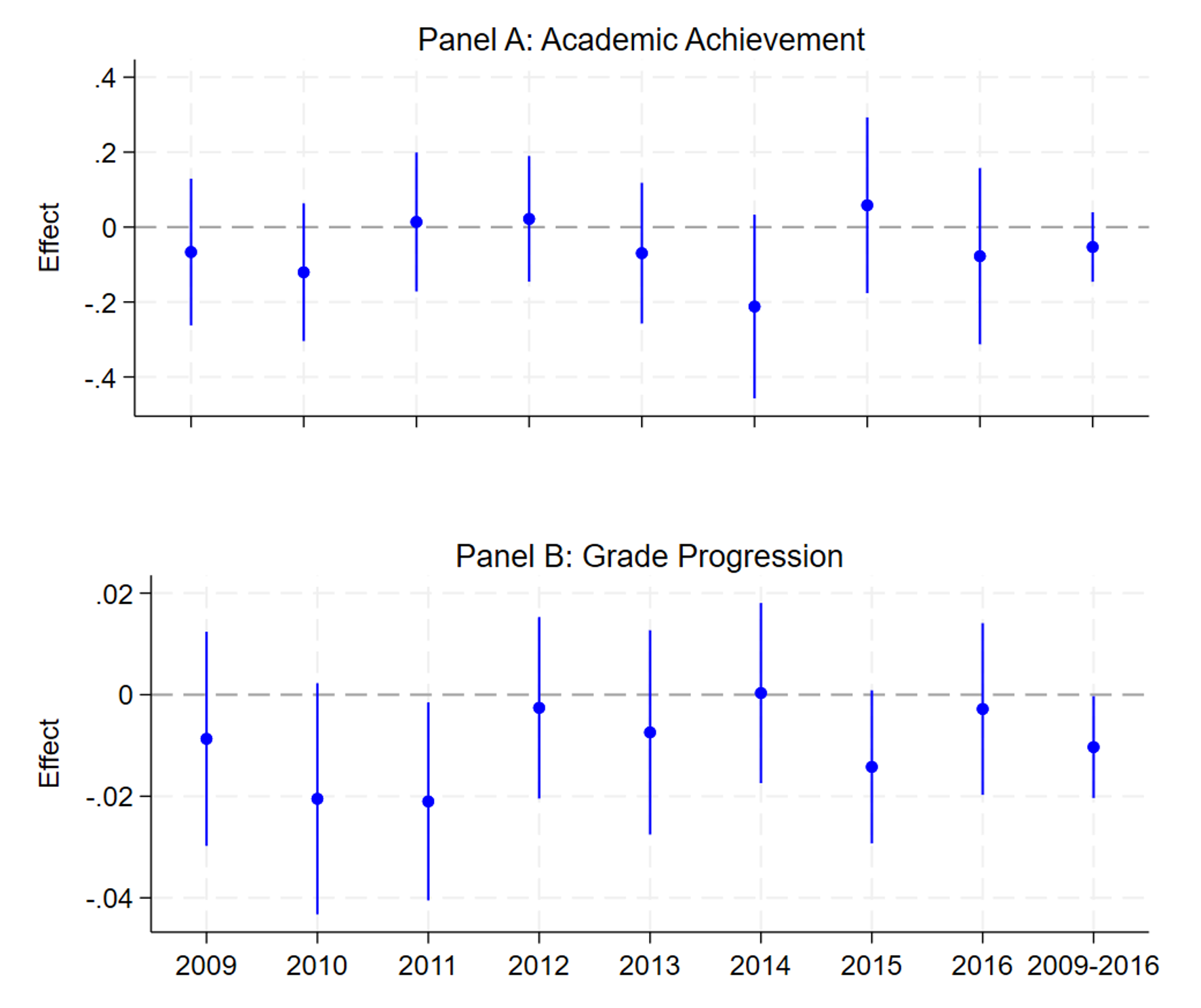 We additionally assessed the impact of the OLPC program on the share of primary students who advanced to the next grade from 2009 to 2016, drawing on data from annual school censuses. As presented in Panel B of Figure 2, the estimates are generally negative, though typically not statistically significant. The pooled results indicate a 1.0 percentage-point decline in grade progression, suggesting that introducing one-to-one computers into classrooms may have had some adverse effects on students’ advancement.[4]