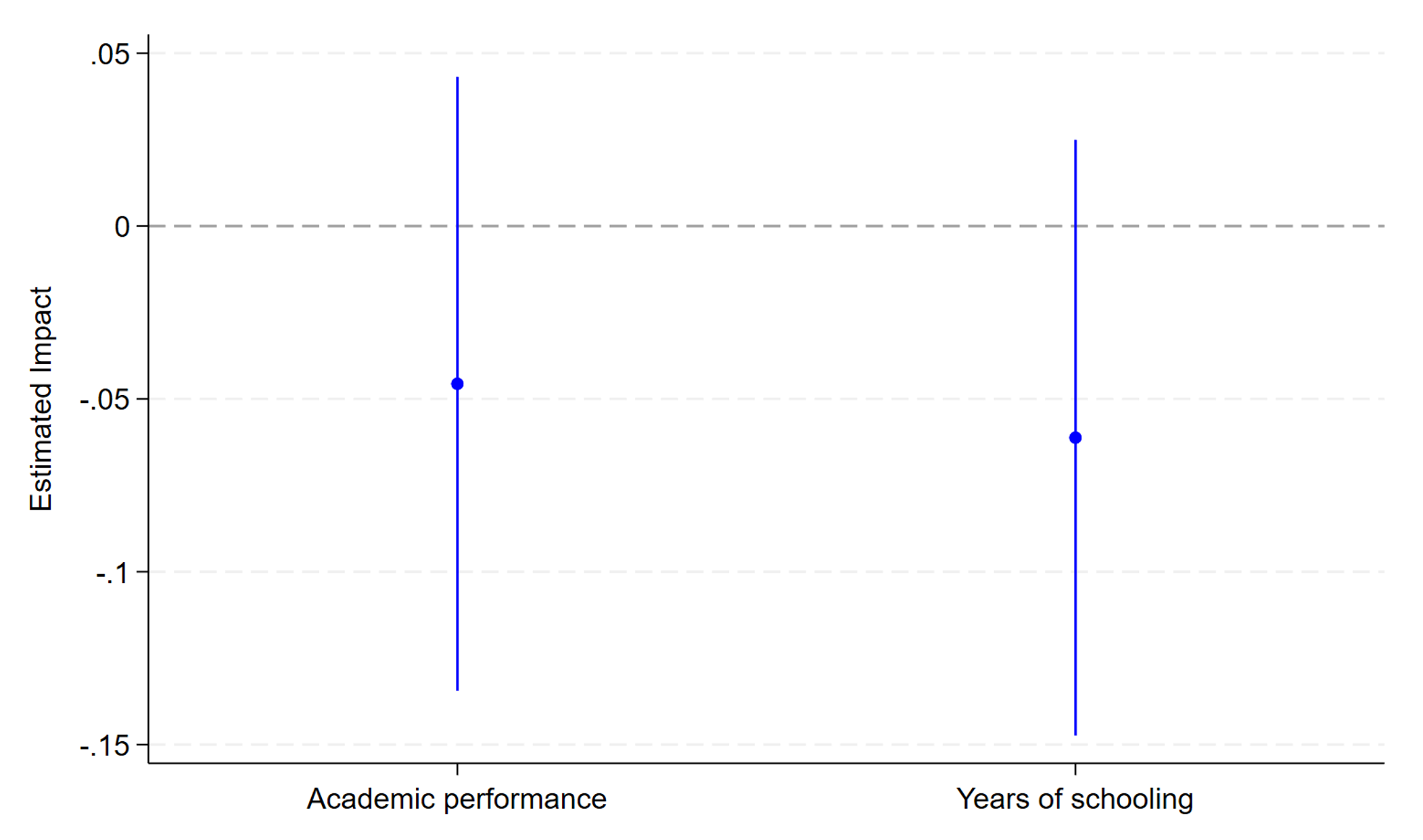 We then assessed the impact of the OLPC program on educational trajectories as students progressed through the school system. We obtained data from 4th and 8th grade national exams, from 5th and 6th grade tests that we administered in a subset of schools, as well as longitudinal administrative data on grade progression from primary to tertiary education. To summarize the results and address concerns related to multiple hypothesis testing, we constructed one measure that averaged all the exams and tests (“academic performance”) and one measure that calculated the number of completed years of schooling (“years of schooling”) for all cohorts through 2019. The estimated impacts on these two measures are shown in Figure 3 below: