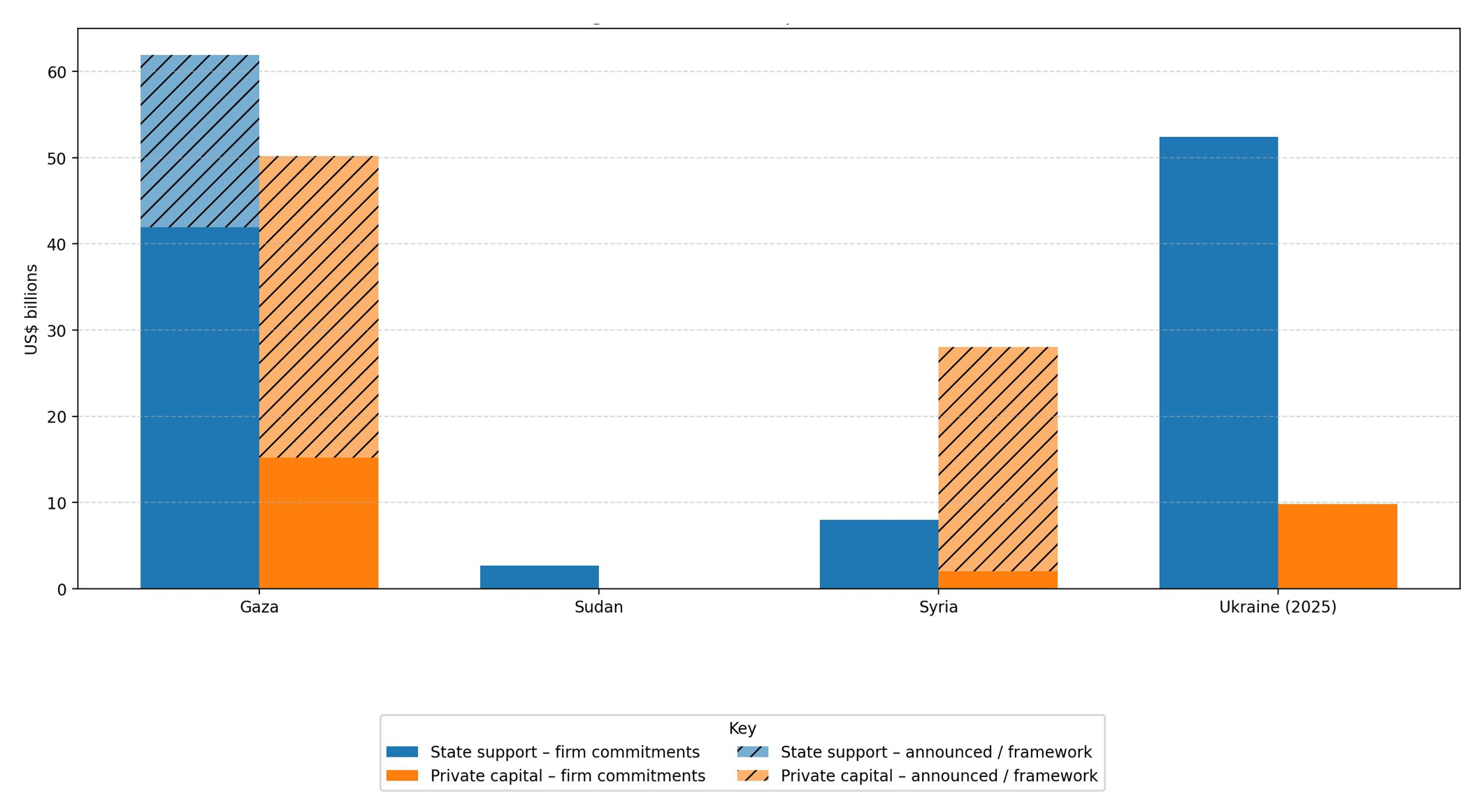 As 2026 unfolds, the landscape of post-conflict reconstruction is being reshaped by the growing prominence of private investment alongside traditional public donor commitments. The surge in announcements from private enterprises and state-owned funds signals a potential shift in how capital is mobilized for fragile states. Recent examples in Gaza, Syria, and Ukraine are demonstrating that private commitments can even surpass those of governments. While the actual inflow of funds often lags rhetoric, the very act of announcing substantial foreign direct investment can serve as a catalyst. Large investment announcements by trusted, known, and deep pocketed private corporations and sovereign wealth funds can in theory accelerate peace processes, foster stability, and attract further capital inflows.